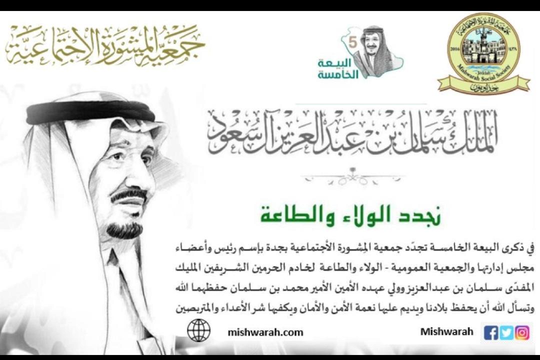 في ذكرى البيعة الخامسة تجدّد جمعية المِشورة الأجتماعية بجدة بإسم رئيس وأعضاء مجلس إدارتها والجمعية العمومية - الولاء والطاعة لخادم الحرمين الشريفين مشاهده المزيد