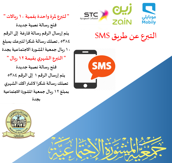 يتم إرسال الرقم رسالة فارغة إلى الرقم 5384 , تصلك رسالة شكرا لتبرعك بمبلغ 10 ريال جمعية المشورة الاجتماعية بجدة